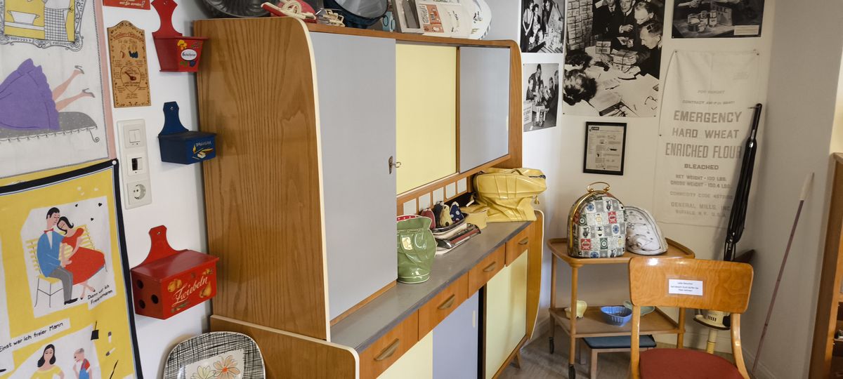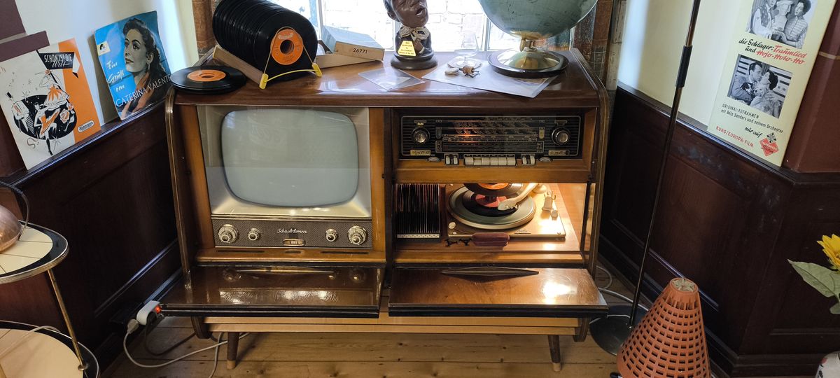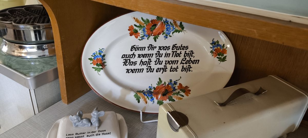 Nach ausgiebiger Mittagspause brachte uns der Bus zum nächsten Ziel: Die Altstadt von Büdingen. Bis zum Beginn der Führung im 50er-Jahre Museum bliebt noch etwas Zeit für einen Bummel in der Altstadt, einen Kaffee oder ein Eis. Mittlerweile lachte auch die Sonne wieder und der Regenschirm wurde nicht mehr benötigt. Im Museum wurde zunächst in der Einführung die Historie diese Museums erläutert. Begonnen hat es mit dem Gründer-Ehepaar durch den Kauf einer Spielzeug-Eisenbahn auf einem Flohmarkt. Nach und nach wuchs die Sammlung und private Räume reichten dazu nicht mehr aus. In Zusammenarbeit mit der Stadt Büdingen und dem unterstützenden Verein konnte das heutige Museum in einem historischen alten Gebäude eröffnet werden. Die Besucher sind i. d. R. begeistert von den Exponaten und Räumen, welche an die Kindheit oder Jugendzeit erinnern.